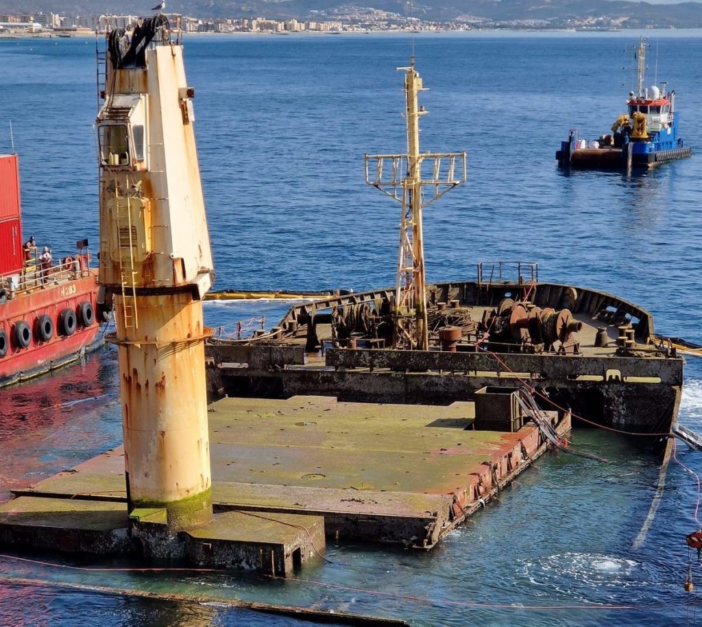 Contractors lift bow of broken OS 35 to the surface allowing them to begin removing shipwreck
