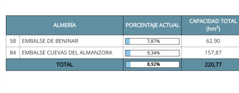 The most at risk province is Almeria, which on average, has a reservoir capacity of just 8.92%, according to figures from Hidrosur, available on the Junta de Andalucia website.
