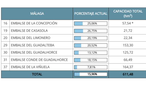 Malaga, meanwhile, is at just 15.96% capacity, while Cadiz is on 17.49%.