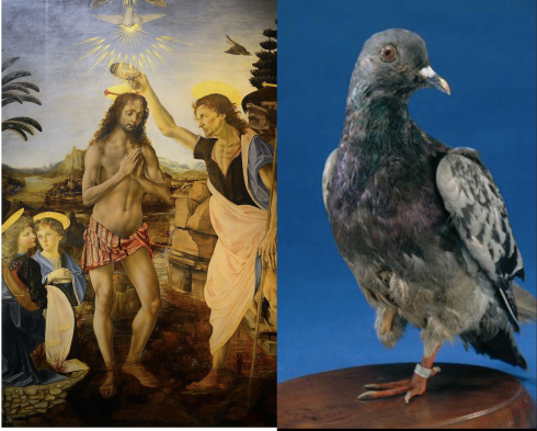 Pigeons and doves hold an important place in human history, symbolising the Holy Spirit in the story of Christ’s baptism (left), and playing decisive roles in global conflicts, as is the case of legendary war pigeon Cher Ami (right). Credit: Wikipedia, Smithsonian.